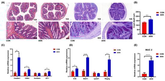 A. muciniphila supplementation during pregnancy and lactation markedly enhanced the intestinal barrier of mothers (D21). Compared with those in the CON group, the number of goblet cells and crypt depth were significantly increased in the AKK group (Figure 2A,B). Analysis of tight junction (TJ) mRNA expression indicated that A. muciniphila-fed mothers had higher mRNA expression levels of claudin 1, claudin 3, and ZO 1 than mothers in the CON group. Furthermore, occludin mRNA expression was not affected (Figure 2C), whereas mucin 2 (MUC2) mRNA expression was increased (Figure 2E). The mRNA expression levels of genes related to goblet cells, including Krüppel-like factor 4 (Klf4) and Math1, showed similar significant changes. However, Spedf mRNA expression was not significantly altered in the AKK group compared with that in the CON group (Figure 2D). Reg3g gene expression in the AKK group was significantly upregulated compared with that in the CON group (Figure 2D). Overall, these results suggest that A. muciniphila supplementation during pregnancy and lactation enhances the intestinal barrier.