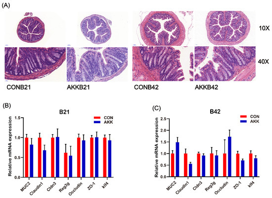 Effects of A. muciniphila supplementation during pregnancy and lactation on the intestinal barrier of mouse offspring. (A) Representative image of hematoxylin–eosin-stained colon tissue of offspring on days 21 and 42 (B21 and B42) after birth. The mRNA expression of genes related to the intestinal barrier of offspring at B21 (B) and B42 (C) in different groups.