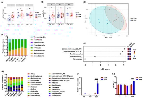 The gut microbiota compositions of mothers at P1, P17, and D21 were analyzed. At the beginning of pregnancy (P1), namely the first day of A. muciniphila supplementation, the community richness index (Chao1 and ACE indices) of pregnant mice was significantly increased (Figure 4A,B), but the community diversity index showed no significant change (Figure S3). As pregnancy progressed, the gut microbiota of the mothers tended to be stable. The AKK group did not display any significant differences in richness and diversity indices. Dramatic differences in the β-diversity of gut microbiota were only observed at D21 (Figure 4C; Bray–Curtis index, p < 0.006). As the mice underwent pregnancy and lactation, the structure of their gut microbiota changed (Figure 4D,E). At the phylum level, the abundance of Actinobacteria first increased and then decreased (Figure 4D; 0.05 vs. 0.13 vs. 0.09, P1 vs. P17, p = 0.014; P17 vs. D21 p = 0.85, in the CON group), whereas the relative abundance of Bacteroidetes gradually decreased (Figure 4D; 0.43 vs. 0.32 vs. 0.29, P1 vs. P17, p = 0.13; P17 vs. D21 p = 0.96, in the CON group). A. muciniphila supplementation shifted the composition of gut microbiota and increased the relative abundance and absolute concentration of A. muciniphila in maternal feces at D21 (Figure 4F,G; p < 0.001, p < 0.001). Furthermore, supplementation with probiotics increased the relative abundance of Ruminococcus_1, but decreased the ratios of Coriobacteriaceae UCG-002, Lachnospiraceae UCG-001, and Ruminiclostridium at D21 (Figure 4H; p < 0.05).