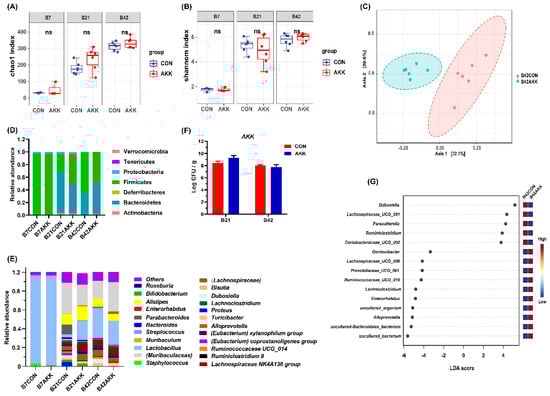 A. muciniphila supplementation results in favorable alterations in the gut microbiota of pups. (A) The Chao1 index of pups. (B) The Shannon index of pups. (C) PCoA describing the β-diversity clustering of the gut microbiota of pups. Major changes in bacterial phyla (D) and genera (E) in pups. (F) A. muciniphila absolute concentration in maternal feces. (G) LEfSe analysis of maternal gut microbiota at D21. ns: not significant difference.