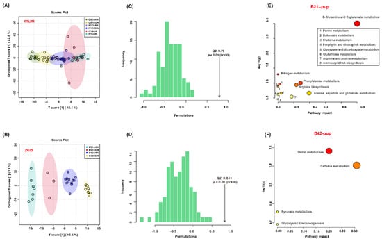 Effects of A. muciniphila supplementation during pregnancy and lactation on the fecal metabolites of mothers and pups. OPLS-DA score plots of fecal metabolites of mothers (A) and pups (B) at different time points. The distribution of test statistic (Q2) and p value for permutation test of (C,D). Pathway analyzes of the differential metabolites in pups at B21 (E) B42 (F).