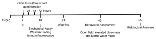 The experimental design is presented in Figure 1. One hundred and nine animals on PND 7 were randomly allocated into four groups: Sham + saline (Sham + Sal), HI + saline (HI + Sal), Sham + Plinia trunciflora extract (Sham + PTE), and HI + Plinia trunciflora extract (HI + PTE). Intraperitonial (i.p.) injections of the extract or of saline were administered 1, 24, 48, and 72 h after HI. PTE was dissolved in sterile saline (0.9%) and administered at a concentration of 10 mg/kg in the Sham + PTE and HI + PTE groups; this dosage was chosen based on a previous study where the Plinia trunciflora extract showed antidepressant-like activity associated with antioxidant potential in vivo [], and on the successful schedule of administration of another plant extract in the HI model []. The Sham + Sal and HI + Sal groups received i.p. saline injections according to their body weight. At 72 h after HI surgery (i.e., after the last injection of PTE), sixty-one animals were euthanized for biochemical (redox homeostasis parameters, n = 25, and western blot, n = 16) and immunofluorescence analysis (n = 20). Forty-eight animals were subjected to behavioral testing at PND 45 and were later euthanized for brain volumetric analysis.