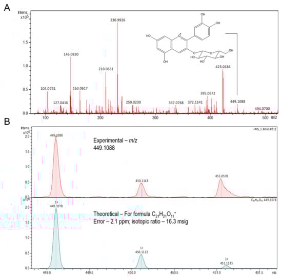 Full mass spectrum of the extract of Plinia trunciflora showing the compound cyanidin-3-O-glucoside (m/z 449.1088) (A). The tandem mass spectrometry (MS–MS) of cyanidin-3-O-glucoside (m/z 449.1088) from the extract of Plinia trunciflora (B).