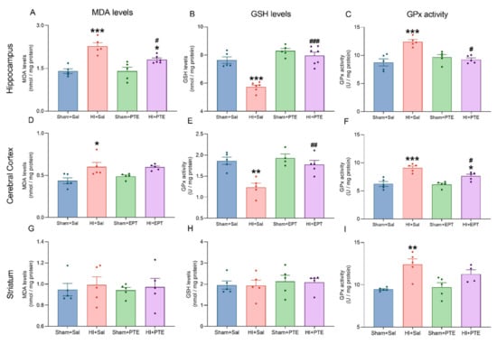 HI-induced oxidative stress biomarker responses. Data are expressed as mean ± SEM. Malondialdehyde (MDA) levels, reduced glutathione (GSH) levels, and glutathione peroxidase (GPx) activity were essayed in the Hippocampus ((A–C), respectively), in the Cerebral Cortex (D–F), and in the Striatum (G–I). * Injury effect (HI vs. control). # Treatment effect (Sal vs. PTE). Sham + Sal (n = 4–5); HI + Sal (n = 4–6); Sham + PTE (n = 4–7); HI + PTE (n = 4–7). Significance was accepted whenever p < 0.05 (* or #), p < 0.01 (** or ##), or p < 0.001(*** or ###) (one-way ANOVA).