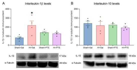 The immunocontent of interleukins evaluated in the right hippocampus (ipsilateral to the carotid occlusion) are presented in Figure 4. HI increased interleukin-1β levels as compared to the controls (F(3.13) = 3.800, p > 0.05); this effect was prevented in HI rats pre-treated with PTE. Interleukin-10 levels did not vary between experimental groups (F(3.14) = 0.3567, p > 0.05).