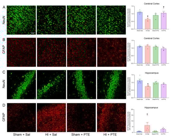 Representative immunofluorescence images showing NeuN (A) and GFAP (B) staining in the cerebral cortex; NeuN (C) and GFAP (D) staining in the hippocampus 72 h following neonatal HI. Data are expressed as mean ± SEM. Quantification of the fluorescence intensity of NeuN and GFAP was performed at 400× magnification by using the mean of five randomly selected fields from each brain. * Injury effect (HI vs. control). # Treatment effect (Sal vs. PTE). Sham + Sal (n = 4–6); HI + Sal (n = 4–5); Sham + PTE (n = 4); HI + PTE (n = 4–5). Significance was accepted at p < 0.05 (* or #) (one-way ANOVA).