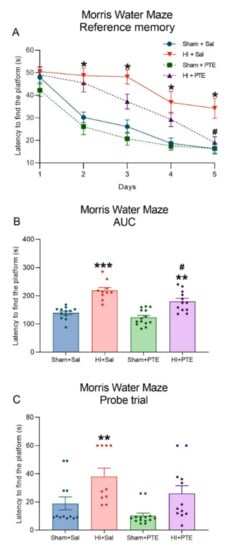 Spatial memory deficits caused by HI are well-described in the literature [,,]. In this study, it was observed that HI animals receiving PTE had a lower latency to find the platform than HI animals during training. However, considering the area under the curve (AUC), it was noted that PTE treatment partially decreased spatial memory impairment caused by HI. Spatial memory impairments are attributable to tissue damage caused by the HI event, namely lesions to the hippocampus, the striatum, and the cerebral cortex. As predicted, PTE administration preserved neural tissue in all the three structures studied; all are known to have participated in spatial memory processing.