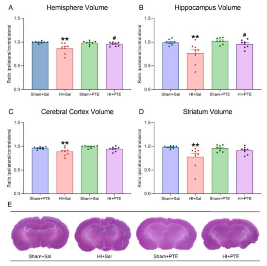 Ipsilateral/contralateral volume ratio of the hemisphere (A), the hippocampus (B), the cerebral cortex (C), and the striatum (D). Representative hematoxylin and eosin-stained coronal brain sections (Bregma −3.3 mm) of adult rats (E). Data were calculated by dividing the volume of selected brain structure ipsilateral to the carotid occlusion (right side) by the contralateral volume. Data are expressed as mean ± SEM. * Injury effect (HI vs. control). # Treatment effect (Sal vs. PTE). n = 8 animals per group. Significance was accepted whenever p < 0.05 (* or #) or p < 0.01 (** or ##) (one-way ANOVA).