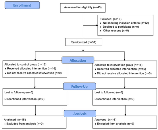 A total of 31 subjects were randomly allocated to the study, with the control group constituting 16 (9 female, 7 male), and the intervention group 15 (12 female, 3 male). The general characteristics of the study participants are shown in Table 1. At baseline, no significant differences (p > 0.05) between the control and intervention groups were found regarding age, anthropometric parameters, and dietary intake.