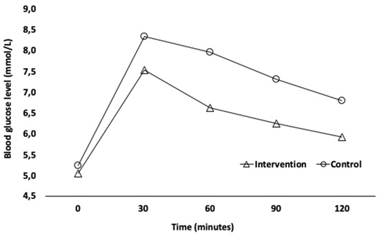 Postprandial blood glucose response for the intervention and control groups are shown in Table 2. The capillary blood glucose concentration did not significantly differ between groups at 0 min (baseline) (p = 0.115). The analysis of independent factors of repeated measures (ANOVA) revealed that there was no interaction between the independent and repeated measures factors (p = 0.092); thus, it is not possible to infer any differences in PBG in different moments. Nevertheless, baobab extract ingestion revealed a slightly decreased of capillary blood glucose level at different moments (Figure 2).