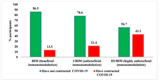 The percentage of participants who contracted and did not contract COVID-19 according to the POLA index is shown in Figure 1. In the BIM diet group, only 13.5 % of participants developed COVID-19, compared to 43.3 % in the HUBIM diet group.
