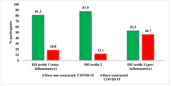 The percentage of participants who contracted and did not contract COVID-19 according to DII tertiles is shown in Figure 2.