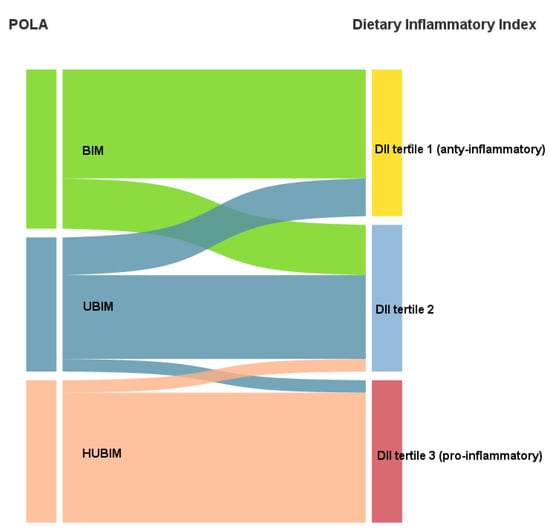 The following descriptive statistics were calculated: mean, standard deviation, median, and quartile range. Compliance with the normal distribution of quantitative variables was verified using the Shapiro–Wilk test. The analysis of variance (ANOVA) or the Kruskal–Wallis test was used to test for differences between the three groups. The odds ratio and the 95% CI were calculated using multiple logistic regression. Cohen’s kappa statistic was used to assess agreement between the DII and the POLA index, and the results were illustrated using a Sankey diagram. Correlations between quantitative variables were assessed using the Spearman rank correlation coefficient. Statistical analyses were performed with PS IMAGO PRO 7 (IBM SPSS Statistics 27) and STATISTICA 13 software. The level of statistical significance was set at α < 0.05.