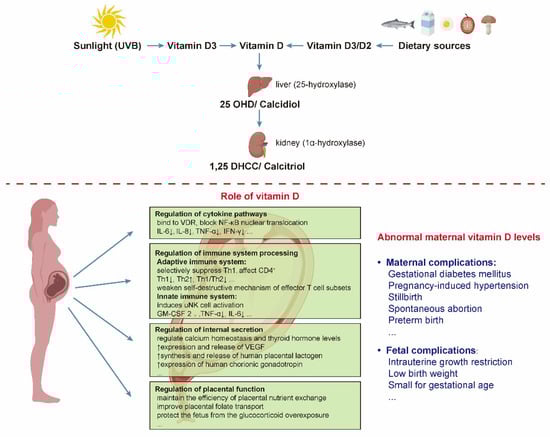 During pregnancy, maternal calcium mobilization increases, and a number of physiological adaptations occur, including increased maternal serum 1,25(OH)2D, DBP, placental VDR, and renal and placental CYP27B1 activity to maintain normal serum 25OHD and calcium levels [96]. Maternal 25OHD crosses the placenta and is the main form of VD in the fetus. The mechanism of maternal VD deficiency during pregnancy has not been fully elucidated. However, recent studies have found that affected pathways may be associated with several factors, such as oxidative stress, imbalance in the regulation of the inflammatory response, and compromise of placental function during pregnancy [97,98].
