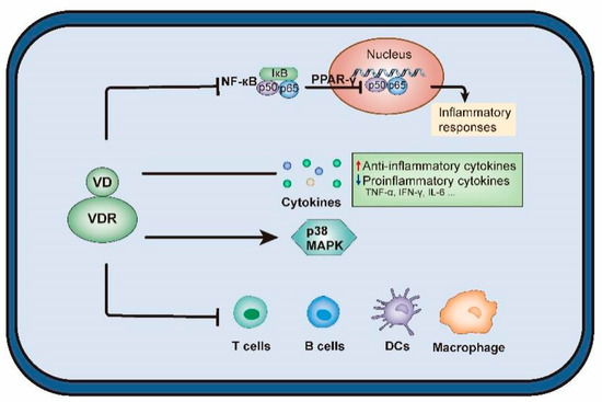 The effects of vitamin D on regulation of cytokine pathways. Abbreviations are as follows: VD, vitamin D; VDR, VD receptor; NF-κB, nuclear factor kappa-B; PPARγ, peroxisome proliferator-activated receptor γ; TNF-α, tumor necrosis factor-α; IFN-γ: interferon-γ, IL, interleukin; MAPK, mitogen activated protein kinases; DCs, dendritic cells.