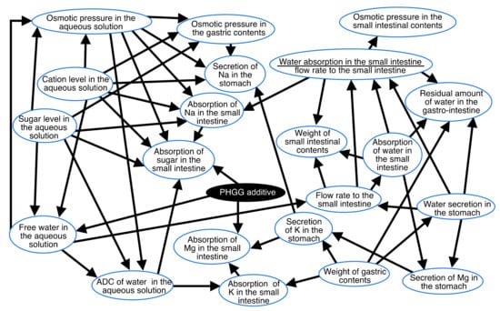 The Bayesian network indicated that the factor affecting the absorption of water in the small intestine was the flow rate to the small intestine (Figure 1). The factor affecting the flow rate to the small intestine was the water secretion in the stomach and free water in the aqueous solution. The factors affecting the free water in the aqueous solution were the sugar, cation, and PHGG additive levels in the aqueous solution. The factors affecting the absorption of sugar in the small intestine were cation and sugar levels, osmotic pressure, and ADC in the aqueous solution, as well as the absorption of Na in the small intestine. The factor affecting ADC in the aqueous solution was the free water in the aqueous solution. One of the factors affecting the free water in the aqueous solution was the PHGG additive (Figure 1).