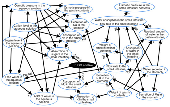We summarized the results of water and sugar absorption with the results of a Bayesian network with quantitative relationships (Figure 2) and the results of two-way ANOVA of variables involving water and sugar absorptions (Figure 3) in Figure 4. That figure shows that PHGG increased the residual amount of water in the gastro-intestinal tract, which depended negatively on the absorption of water in the small intestine/the flow rate to the small intestine. The absorption of water in the small intestine depended positively on the flow rate to the small intestine, which depended negatively on the free water in the aqueous solutions (Figure 1 and Figure 4). Furthermore, the PHGG additive decreased the free water in the aqueous solutions (Figure 1 and Figure 4). PHGG likely decreased water absorption in the small intestine by decreasing the free water in the aqueous solutions. Accordingly, an oral rehydration solution with PHGG could slow the rate of water absorption.