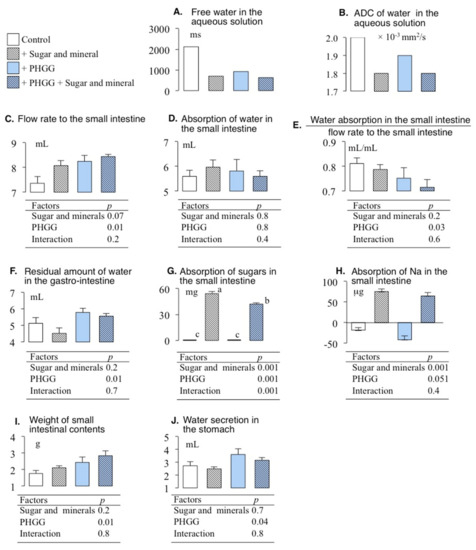 The present study could not compare the effects of cations with those of sugar on sugar absorption because of the existence of confounding factors, namely, the correlation between the ADC of water in the aqueous solution and the absorption of sugars in the small intestine (Figure 3 and Figure 4), which might have given rise to misleading results. The design of the present study might leave room for further improvements. However, the main purpose of this study was to determine the effects of PHGG on water absorption using oral rehydration solutions. In this regard, it achieved its main purpose to some extent.
