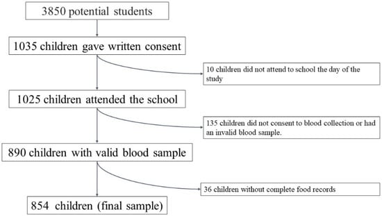 A total of 1035 schoolchildren (49.2% boys) were initially included. Ten participants did not attend school on the day of the anthropometric study and were, therefore, excluded from the analysis. Valid dietary data were only obtained from 965 schoolchildren (48.8% boys), valid blood samples from 890 participants (48.4% boys), and 854 (48.4% boys) who have both blood and dietary samples to constitute the sample of the present study.