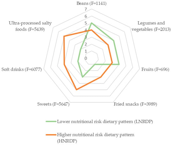 Two dietary patterns were identified based on the cluster analysis. The lower nutritional risk dietary pattern (61.6%; 95%CI: 60.6–62.6) was characterized by a higher intake of beans, fruits, vegetables, and greens during the week, and a lower of salty ultra-processed food products, soft drinks, sweets, and fried snacks. The higher nutritional risk dietary pattern was prevalent in 38.4% (95%CI: 37.4–39.4) of Brazilian adolescents and was characterized by a higher weekly intake of ultra-processed food products to the detriment of in natura or minimally processed foods (Figure 1).