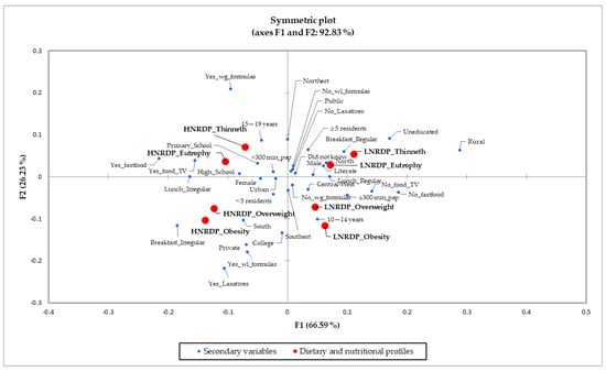Correspondence analysis associated these dietary and nutritional profiles with the secondary variables and identified four significant clusters arranged in different quadrants of the symmetrical graph and whose total represents a model that explained 92.83% of the data variability (Figure 2).