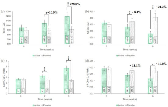 In the active treatment arm, the basal (362.4 ± 16.7 mM) concentration of GSSG in erythrocytes was statistically significant decreased by 8.4% (332.0 ± 17.8 mM, p = 0.0021) and +21.2% (278.3 ± 19.0 mM, p = 0.0001) after 2 and 8 weeks of use, respectively. The GSSG variation in the placebo treatment arm was not statistically significant. The GSSG variation vs. baseline in the active treatment arm was statistically significant when compared to the variation in the placebo treatment arm (p = 0.0012 and p = 0.0001, after 2 and 8 weeks, respectively).