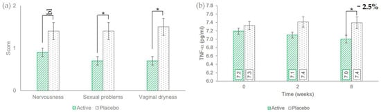 (a) Output of selected items of Menopause rating scale questionnaire 8 weeks after product use. (b) Serum TNF-α levels. Data are average (± standard error). The intergroup statistical analysis is reported above the bar as follows: bl borderline, * p < 0.05.