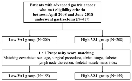 This study’s flowchart is shown in Figure 1. A total of 417 patients met the eligibility criteria, and 209 (50.1%) and 208 (49.9%) were assigned to the low- and high-VAI groups, respectively. Following PSM, both groups had 155 patients. Patient background is shown in Table 1. Before matching, the high-VAI group had a higher BMI (p < 0.001), a greater number of patients with diabetes (p = 0.018), a higher SMI (p < 0.001), and a higher VAI (p < 0.001). After matching, there was no significant difference in factors other than BMI and VAI that were not adjusted.