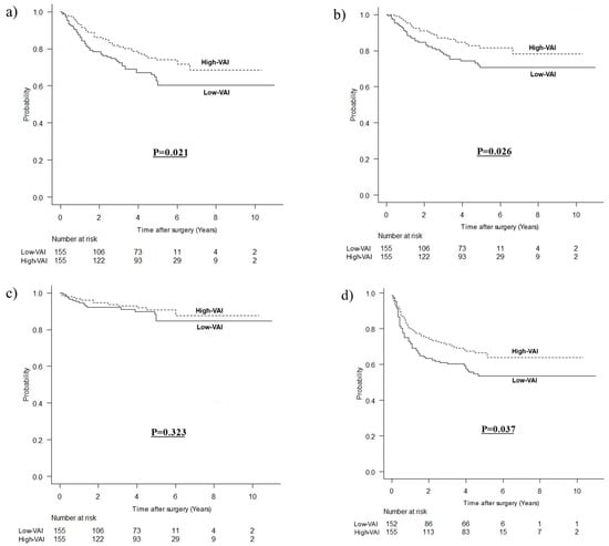 The median duration of follow-up was 48 months (interquartile range, 21–60 months). The OS was significantly better in the high-VAI group (HR 0.611, 95%CI 0.403–0.928, p = 0.021). There was no difference in the OCS (HR 0.691, 95%CI 0.331–1.440, p = 0.323), but the CSS was significantly better for the high-VAI group (HR 0.563, 95%CI 0.339–0.933, p = 0.026). The DFS was better in the high-VAI group (HR 0.678, 95%CI 0.470–0.977, p = 0.037) (Figure 2).