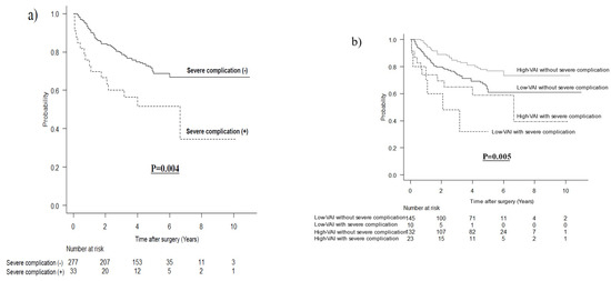 The OS was worse in the severe complications group (HR 2.223, 95%CI 1.295–3.816, p = 0.004) (Figure 3a). The OS rates, stratified for both VAI and severe complications, are shown in Figure 3b. Patients with high-VAI without severe complications had the best survival rates, and patients with low-VAI with severe complications had the worst survival rates (p = 0.005).