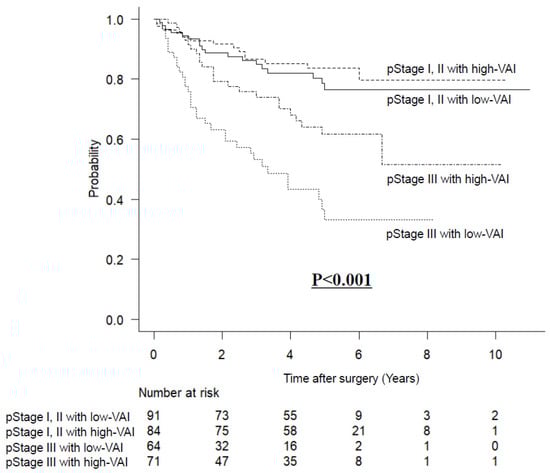 The OS rates, stratified for both VAI and pStage, are shown in Figure 4. In pStage III, patients with high-VAI had better survival rates than patients with low-VAI (p < 0.001).