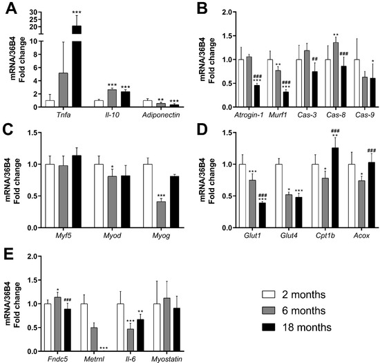 Effects of aging (2, 6 and 18 months) on the mRNA expression of genes related to inflammation (A), muscle damage (B), muscle regeneration (C), glucose uptake and fatty acid oxidation (D) and myokine expression (E) on the gastrocnemius muscle of C57BL/6J female mice fed a standard diet. Data presented as mean (SD); n = 7–10. * p < 0.05, ** p < 0.01, *** p < 0.001 vs. 2-month-old mice; ## p < 0.01, ### p < 0.001 vs. 6-month-old mice.