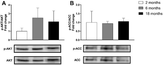 Representative Western blot and densitometry analysis of the effects of aging (2, 6 and 18 months) on phosphorylated AKT and total AKT (A) and phosphorylated ACC and total ACC (B) in the gastrocnemius muscle of C57BL/6J female mice fed a standard diet. Band densities of phosphorylated AKT and ACC were normalized by total AKT and ACC, respectively. Data presented as mean (SD); n = 3–4.
