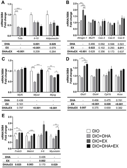 Effects of long-term DHA supplementation and/or exercise training on genes related to inflammation (A), muscle damage (B), muscle regeneration (C), glucose uptake and fatty acid oxidation (D) and myokine expression (E) in the gastrocnemius muscle of 18-month-old DIO female mice. Data presented as mean (SD); n = 6–10. DIO: Diet-induced obese; EX: Treadmill training. For two-way ANOVA, when an interaction was found, contrast analysis was performed. The p values for the main factors, DHA supplementation (DHA), exercise (EX) and the interaction between both (DHAxEX) are shown in the corresponding rows of the tables below the figures. Statistically significant p values are marked in bold. Significant differences between groups are shown above the corresponding comparisons: * p < 0.05, ** p < 0.01, *** p < 0.001.