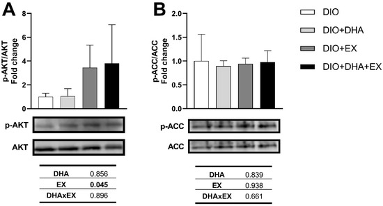 The two-way ANOVA revealed a significant interaction between DHA and exercise in Glut1 mRNA expression (p = 0.007), with the contrast analysis showing a significant increase in the exercise group compared with the DIO group (p < 0.001, d = 5.59). In the presence of DHA, exercise further increased Glut1 expression compared to exercise alone (p = 0.029, d = 1.12). Glut4 mRNA expression increased in the trained groups vs. the non-trained groups (p < 0.001) (Figure 3D). In parallel, a significant increase was found in p-AKT/AKT ratio in the exercise groups (p = 0.045, 3.5-fold and 3.8-fold for DIO + EX and DIO + DHA + EX, respectively) compared with the DIO group (Figure 4A). Exercise also increased the mRNA expressions of Cpt1b (p = 0.020) and Acox (p < 0.001), while DHA supplementation alone did not cause any significant changes in the expression of genes involved in fatty acid oxidation (Figure 3D). On the other hand, no significant changes were detected in p-ACC/ACC ratio by any of the treatments (Figure 4B).