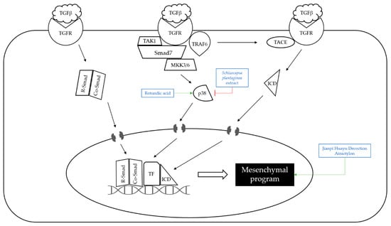 Schematic diagram of metastasis. Metastasis starts with TGF receptor stimulation, which induces the complex of R-Smad and Co-Smad, as well as p38 and ICD to move into the nucleus. These factors control gene transcription to upregulate the mesenchymal program. P38 was upregulated by rotundic acid and downregulated by Schizocapsa plantaginea extract. Jianpi Huayu Decoction and atractylon upregulated the mesenchymal program. The mechanisms of natural products affecting metastasis were indicated. The upregulations of the molecules were marked with a green arrow and the downregulations with a red arrow.