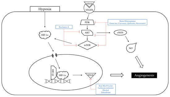 Schematic diagram of angiogenesis pathway. HIF-1α, which is activated by hypoxia, induces VEGF synthesis and leads to angiogenesis. Moreover, PI3K/AKT/mTOR pathway regulates cell proliferation. PI3K was downregulated by Butea Monosperma and mixture of green tea, curcumin, quercetin, resveratrol extracts. Both AKT and mTOR were inhibited by Biochanin A, Butea Monosperma and mixture of green tea, curcumin, quercetin, resveratrol extracts. VEGF was downregulated by bear bile powder, Lachnum melanin, dieckol, and zerumbone. The mechanisms of natural products affecting angiogenesis were indicated. The upregulations of the molecules were marked with a green arrow and the downregulations with a red arrow.