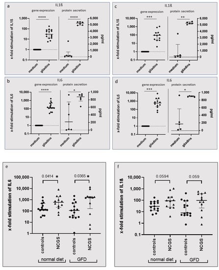 Gene and protein expression of PBMCs after incubation with tryptic-digested gliadins. All results are shown as median with interquartile range. (a,b) IL1ß and IL6 expression of PBMCs from healthy controls (n = 15) and (c,d) from patients with NCGS (n = 12). The Wilcoxon signed rank test revealed significant upregulation of gene expression of PBMCs after stimulation with gliadins. The paired t-test revealed significant differences in gliadin-induced protein secretion of PBMCs in healthy controls (n = 6) and patients with NCGS (n = 5). (e,f) Gene expression of gliadin stimulated PBMCs under a normal diet and after a 6-week GFD. The Mann–Whitney test was used to detect significant differences in gene expression between NCGS and controls. (e) The gliadin-induced expression of IL6 mRNA was significantly higher in the PBMCs of patients with NCGS compared to controls before (with a normal diet) and also after a 6-week GFD. (f) Stimulation by gliadins caused a distinct upregulation of IL1ß mRNA in the PBMCs of patients with NCGS compared to controls, although not significantly so. Fold-change gene analysis was carried out with the 2ΔΔCt method, using GAPDH as a housekeeping gene, and was related to values for the culture medium without cereal stimulants as control. * p < 0.05; ** p < 0.01, *** p < 0.005, **** p < 0.0001.