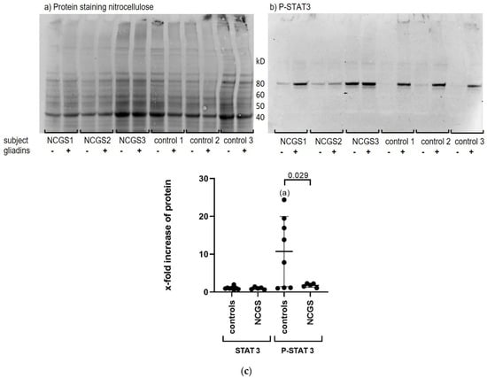Gliadin-induced phopho-STAT3 protein (P-STAT3) expression in the PBMCs of healthy controls and patients with NCGS. The figure shows representative figures of (a) total protein staining (fluorescence) of PBMC lysates separated on 4–12% TGX Stain-Free™ protein gel after transfer to nitrocellulose, and (b) Western blot for P-STAT3 in the PBMC of patients with NCGS and healthy controls before and after 24 h stimulation with gliadins. Two biological replicates were performed for n = 5 out of 8 healthy controls and n = 3 out of 5 patients with NCGS, and one analysis each for the other subjects. Image Lab 6.1 (BioRad) was used to analyze the expression of P-STAT3 protein. Normalization was performed on proteins of 40 kD, i.e., ß-actin (Supplementary Figure S1). (c) The figure shows the x-fold enhancement of STAT3 and P-STAT3 protein in the PBMCs from healthy controls and patients with NCGS after stimulation of PBMCs with gliadins compared to a medium without cereal stimulants. Results are shown as median with interquartile range. In the healthy controls, the one-sample t-test revealed a significant upregulation of P-STAT3 by gliadins compared to medium control. (a) p = 0.021. The two-tailed t-test with Welch’s correction revealed significant differences in upregulation of P-STAT3 in PBMCs induced by gliadins between healthy controls and NCGS (p = 0.029). p < 0.5 is considered to be statistically significant.
