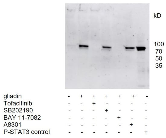 To confirm the activation of STAT3 by gliadins and to study the signaling pathway of gliadin stimulation, PBMCs from healthy controls were used as they showed the strongest effect on P-STAT3 upregulation. Western blot analysis with cell lysates from PBMCs stimulated with gliadins revealed that preincubation of the PBMC with Tofacitinib citrate, a prominent JAK inhibitor with downstream effects on STAT3, prevented the gliadin-induced phosphorylation of STAT3. In addition, the NFκB inhibitor BAY 11-7082, which is also known to attenuate the phosphorylation of activators of STAT3 [], effectively blocked P-STAT3 upregulation in PBMCs. In contrast, p38 and Alk 4,5,7 inhibitors (SB202190 and A8301, respectively) did not influence gliadin-induced upregulation of P-STAT3 (Figure 3).