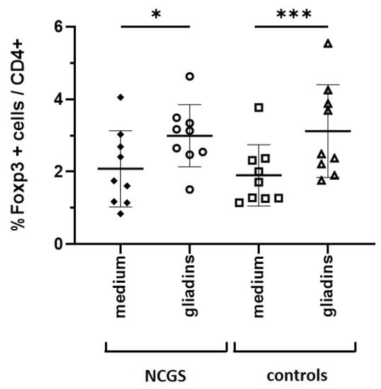 Percentage of FoxP3+ cells in total CD4+ cells. The paired t-test revealed significant differences in gliadin-induced increase in FoxP3+ regulatory T cells in patients with NCGS (n = 9) and healthy controls (n = 9) compared to medium control. * p < 0.05, *** p < 0.001. Exemplary Fluorescence-activated cell sorting (FACS) panels are shown in Supplementary Figure S2.