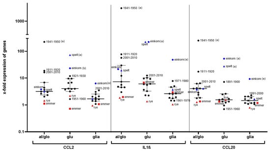 X-fold upregulation of CCL2, IL1ß, and CCL20 in THP1 cells after stimulation with cereal proteins. Gene expression is shown after 24h stimulation of THP1 cells with a peptic-tryptic digestion of albumin/globulin fractions (al/glo), glutenins (glu), or gliadins (glia) (0.5 mg/mL each). Fold-change gene expression was calculated with the 2−ΔΔCt method, using GAPDH as a housekeeping gene, and was related to values for the culture medium without stimulants as a baseline. Data are shown as medians with interquartile range of two independent biological experiments with technical replicates, respectively. One-way ANOVA with multiple Tukey test was used to reveal significant changes in gene expression. (a) Significant differences to all other cereal fractions; (b) significant differences compared to wheat cultivar 1951–1960, rye, spelt, and emmer.