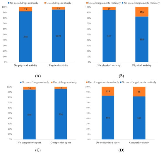 Number of subjects performing physical activity and routinely using drugs (A) or supplements (B). Number of subjects practicing competitive sports and routinely using drugs (C) or supplements (D).