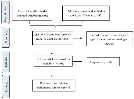 In Figure 1, a flow chart shows the records identified in each database and the total number of articles (n = 386); the records that were screened and the eligible ones; and the total number of studies included in this review (n = 75). After a refined search, 28 papers were found to be present in both databases. Of the total of 75 papers in the final selection, 22% (n = 17) were exclusive to the ‘Scopus’ database and 40% (n = 30) were exclusive to the ‘PubMed’ database.