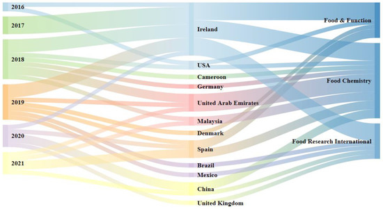 Sankey diagram for the selected articles relating year of publication, authors’ country of origin, and the three leading scientific journals that published the antidiabetic bioactive peptide studies.