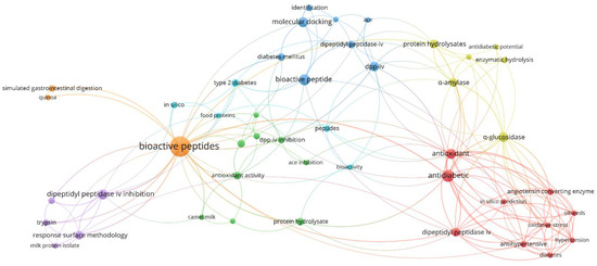 The author’s keywords that appeared among the selected published articles more than twice, were recorded and are shown in Figure 3. Two hundred and eighteen different keywords were found among the included articles, of which 46 appeared at least in two different papers. The most used keywords were: ‘bioactive peptides’ (occurrence 28, total link strength 54) and ‘antidiabetic’ (occurrence 10, total link strength 38). When the keywords were grouped according to their meaning, the top five groups were: ‘bioactive peptide, bioactive peptides, and bioactivity’ (occurrence 38), which also showed up as the main keyword-group followed by ‘DPP-IV’ and its variations, ‘dipeptidyl peptidase IV, dipeptidyl peptidase IV inhibition, dipeptidyl peptidase-IV and DPP-IV inhibition’ (occurrence 25); ‘antidiabetic, antidiabetic activity and antidiabetic potential’ (occurrence 16); ‘α-glucosidase, α-glucosidase inhibition, α-glucosidase inhibitory activity’ (occurrence 10); and ‘protein hydrolysate, and protein hydrolysates’ (occurrence 9). As expected, the most cited keywords match the descriptors used in the bibliometric search. The evaluation of the keywords highlighted that, within the most tested enzymes related to diabetes, DPP-IV was the most represented in the author’s keywords, indicating that it has been the most tested, followed by alpha-glucosidase, the second most tested enzyme.