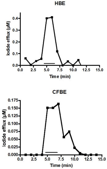 Citrate stimulated iodide efflux. CFTR can also export iodide instead of chloride. 16HBE14o- or CFBE41o- were loaded with iodide and the iodide concentration was measured by an iodide-sensitive electrode in 1 min intervals. The bar indicates the time period of exposure to 100 µM of citrate.