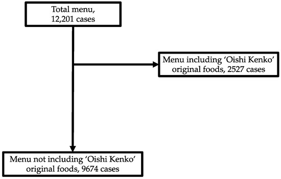 Of the 12,201 cases in the total food menu, 2527 cases of the food menu containing”Oishi Kenko” original foods were excluded because the exact calculation of sucrose was not possible due to the inability to cite the Food Composition Table of the Ministry of Education, Culture, Sports, Science, and Technology.