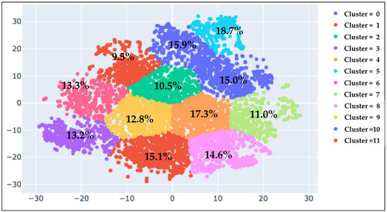 Of the total 12,201 food menus, 2527 food menus that included “Oishi Kenko” original foods were excluded, and 9674 food menus were included in the analysis. The menus established by the old “menu calendar” (now “meal schedule”) were included (Figure 1). Each food menu was standardized using the 50 elements of the Japanese Food Composition Table and sucrose as explanatory variables. The standardized dataset was subjected to the elbow method to determine the optimal number of clusters, resulting in k = 12 (Figure S1). t-SNE (perplexity = 50) was used to remove dimensions, and the multidimensional data of the menus were displayed in two dimensions (Figure 2).