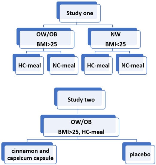 In the second study, 20 individuals with OW/OB were enrolled into a double-blind, placebo-controlled trial consisting of two visits during which they received a HC meal with the capsule containing 2 g of cinnamon (Cinnamomum verum, Dary Natury Pvt., Ltd., Koryciny, Poland) and 200 mg of capsicum (Capsicum annum, Organic Cayenne Pepper ground, Lebensbaum, Diepholz, Germany) or with the placebo capsule (composed of maltodextrin only). Between the visits there was a wash-over period of around 1–3 weeks. The meal was composed of wheat roll (100 g), fruit jam (50 g), and juice (200 mL).